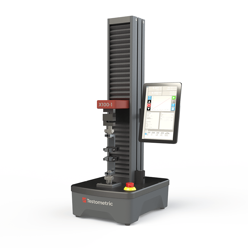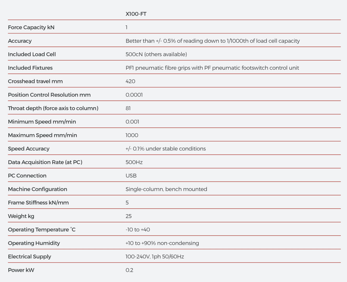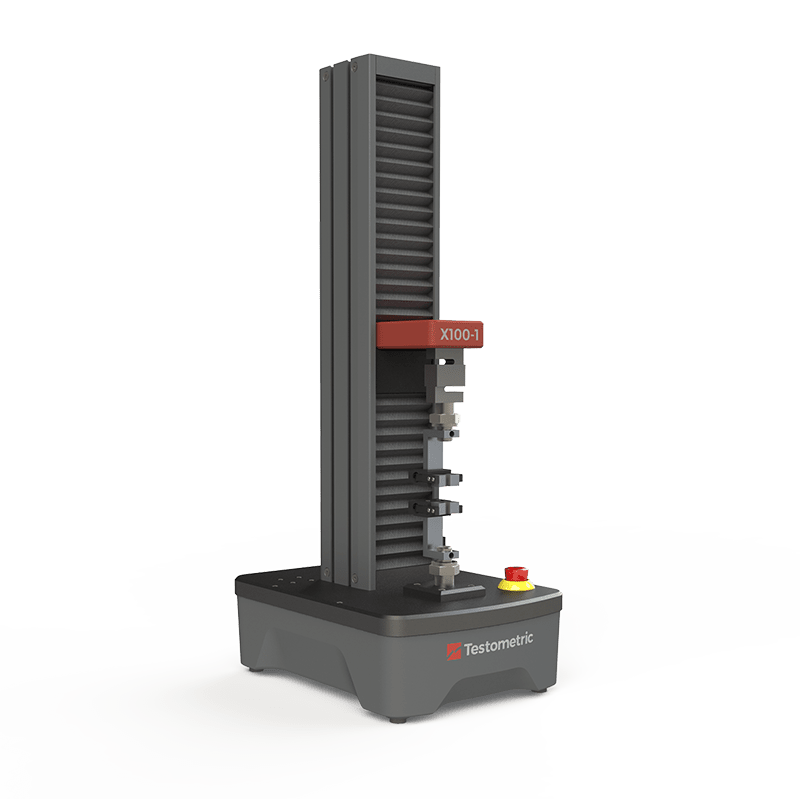 Dedicated fibre test model based on the X100-1 Universal Testing Machine, complete with pneumatically operated grips for testing natural or synthetic single fibres according to BS EN ISO 5079 or BS 3411. Featuring full computer control and precision AC servo drive system, the universal design allows the machine to be easily adapted for other test types (tensile, compression etc.) using Testometric’s extensive range of grips and fixtures.